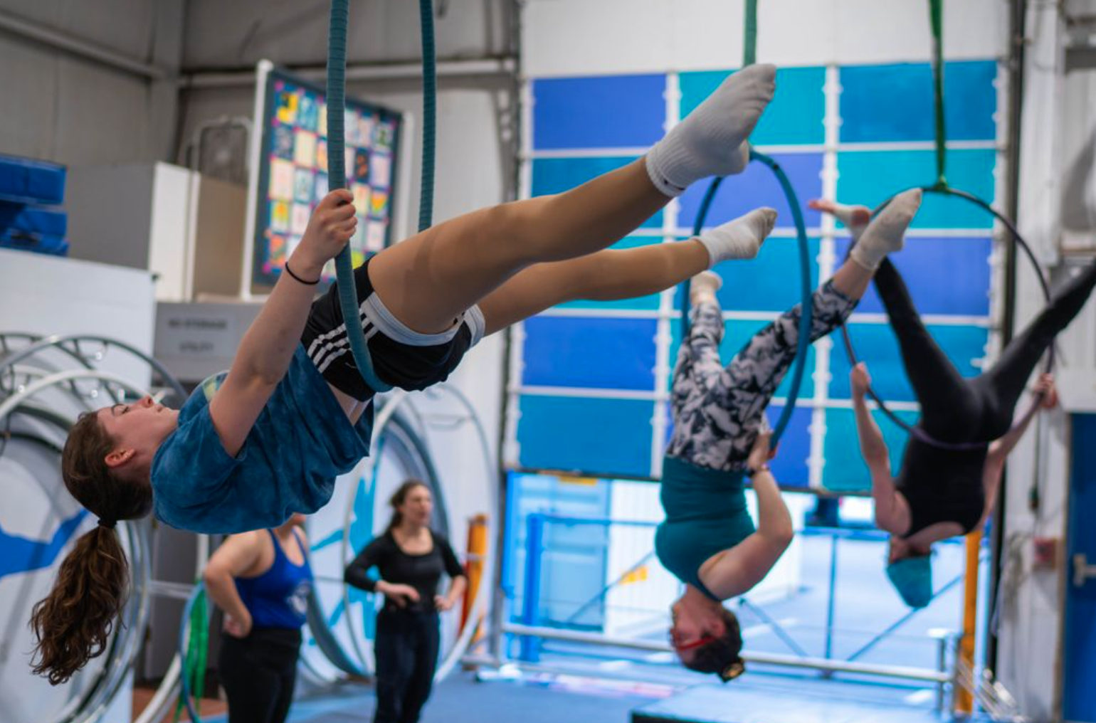 The aerial hoop (or lyra) is a relative of the trapeze. It is a steel circle apparatus that is suspended from the ceiling either from one or two ropes with a swivel so it has the ability to spin! Think of it like a big circular swing! Hoop students will swing, spin, and learn hoop vocabulary such as poses and movements under, in, and above the hoop while being right-side-up and up-side-down. All hoop classes will incorporate lessons for strength, creativity, and coordination, as well as injury prevention.